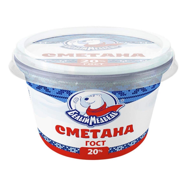 Сметану "Белый Медведь" производят традиционным способом из сливок путем сквашивания их закваской, приготовленной на чистых культурах молочнокислых бактерий. Сметана не содержит никаких посторонних добавок, благодаря чему имеет приятный кисломолочный вкус и нежную консистенцию