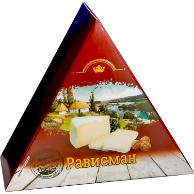 Сыр завернут в кашированную фольгу. Поверхность сыра покрыта корочкой белой плесени.Вкус мягкий, кисловатый. Консистенция плотная, гладкая однородная.
