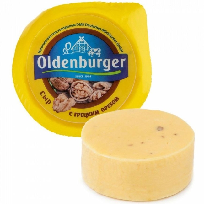 Сыр OLDENBURGER с грецким орехом 45%, без змж относится к полутвердым сортам. Продукт нежный и пластичный, рисунок на разрезе ажурный, состоит из угловатых глазков с россыпью дробленого грецкого ореха. Терпкость и аромат грецких орехов отлично оттеняют нежный, сливочный вкус продукта. В кулинарии сыр с грецкими орехами рекомендуют сочетать с медом и употреблять как изысканный десерт. Также его используют для приготовления основных блюд и салатов. Гармонично сочетается с белыми полусладкими винам