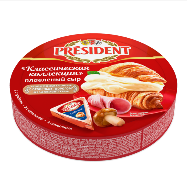 Сыр (содержит уплотнитель хлорид кальция), вода питьевая, масло сливочное, сухое обезжиренное молоко, творог, молочный белок; (для сыра «Сливочный» – сливки сухие; для сыра с ветчиной – говядина, вода питьевая, соль, загустители (Е1442, Е407, E412, E415, E410), регуляторы кислотности (лимонная кислота, Е327, Е450, Е451), антиокислитель изоаскорбат натрия, усилители вкуса и аромата (Е621, Е627, Е631, Е635), смесь специй, фиксатор окраски (Е250), краситель красный рисовый, ароматизатор,