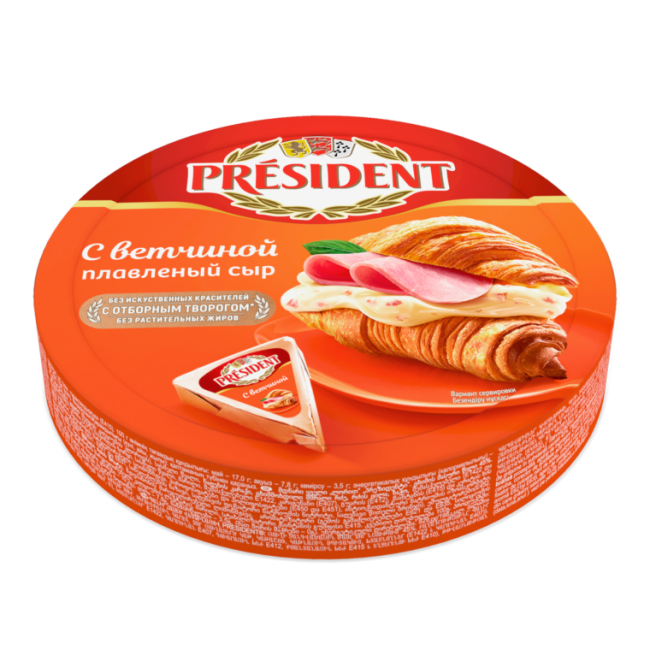 Сыр (содержит уплотнитель хлорид кальция), вода питьевая, масло сливочное, молоко сухое обезжиренное, творог, молочный белок, загустители (Е1422, Е407), ветчина (говядина, вода питьевая, соль, загустители (Е1442, Е407, Е412, Е415, Е410), регуляторы кислотности (лимонная кислота, Е450, Е451), антиокислитель изоаскорбат натрия, усилители вкуса и аромата (Е621, Е627, Е631), смесь специй, фиксатор окраски нитрит натрия, краситель красный рисовый), эмульгаторы (Е452, Е450, Е331, Е339), сыворотка