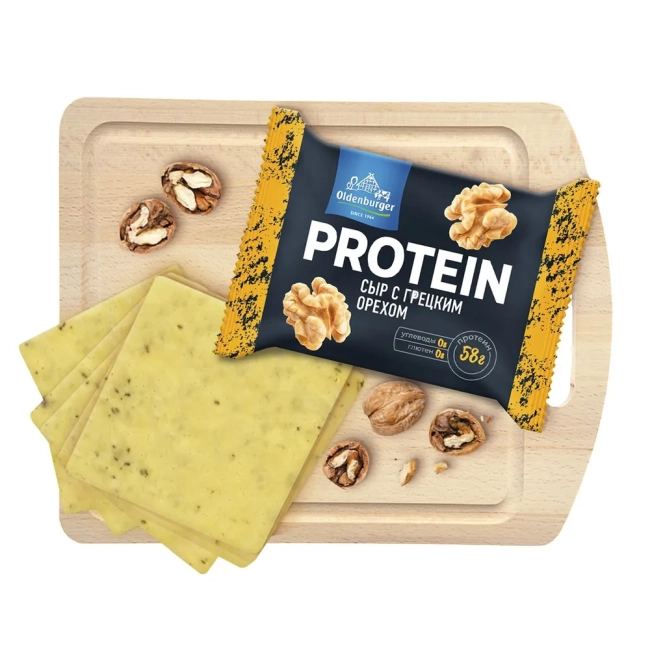 Сыр протеиновый OLDENBURGER с грецким орехом 30%, ломтики, без змж изготовлен на основе нормализованного пастеризованного молока с использованием заквасочных культур, мезофильных и термофильных молочнокислых микроорганизмов. По технологии изготовления полутвердый. Он прекрасно подходит для приготовления салатов, бутербродов, горячих и холодных закусок, а также вторых блюд. Кроме того, будет хорош в качестве самостоятельной закуски на сырной тарелке, подаваемой к вину.