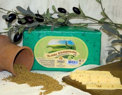 Отличительной особенностью сыра «Золото Ставрополья» с наполнителем, состоящим из зерен пажитника, является его великолепный умеренно выраженный сырный вкус с тонким ароматом грецкого ореха. Консистенция сыра нежная, эластичная однородная. Рисунок состоит из глазков неправильной формы с наличием зерен наполнителя, который используется по всему миру как пряность. Попробовав нашу новинку, потребитель высоко оценит новый элитный продукт.