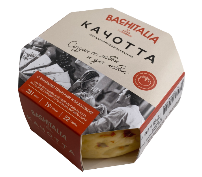 Молоко коровье цельное пастеризованное, наполнитель (базилик (зелень), петрушка (зелень), томаты вяленые, специи и овощи сушеные: томаты, чеснок, перец черный; сахар, соль, уксус винный, ароматизатор), соль поваренная пищевая, бактериальные термофильные заквасочные культуры, кальций хлористый (уплотнитель), нитрат калия (консервант), молокосвертывающий ферментный препарат микробного происхождения. Массовая доля жира в сухом веществе 45%.