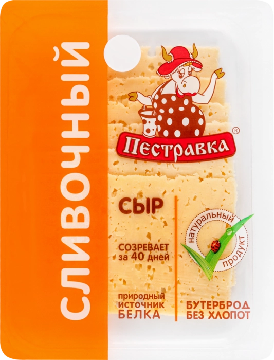 Полутвердый сыр с выраженным сливочным вкусом и ажурной текстурой. Изготовлен из натурального молока. Без растительных жиров.