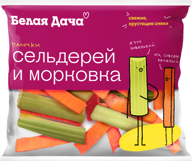 ХРУСТЯЩИЙ МИКС Белая Дача ИЗ ПАЛОЧЕК МОРКОВКИ И СЕЛЬДЕРЕЯ Полезный перекус! 100% готовы к столу: вымыты, удобно нарезаны. Морковная Палочка в компании нового героя, палочки Сельдерея, идеальный микс для быстрых и полезных перекусов на бегу.