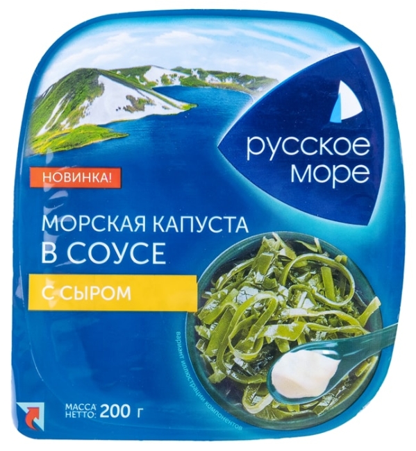 Капуста морская (ламинария японская) шинкованная маринованная (капуста морская вареная, сахар, соль, регулятор кислотности уксусная кислота ледяная), соус майонезный с ароматом сыра (вода питьевая, масло: подсолнечное (С) или рапсовое (D); сахар, кукурузный крахмал, уксус, соль, яичный желток, загустители: ксантановая камедь, гуммиарабик; регулятор кислотности молочная кислота, консерванты: бензоат натрия, сорбат калия; ароматизаторы, подсластитель сахарин, усилитель вкуса и аромата глутамат нат