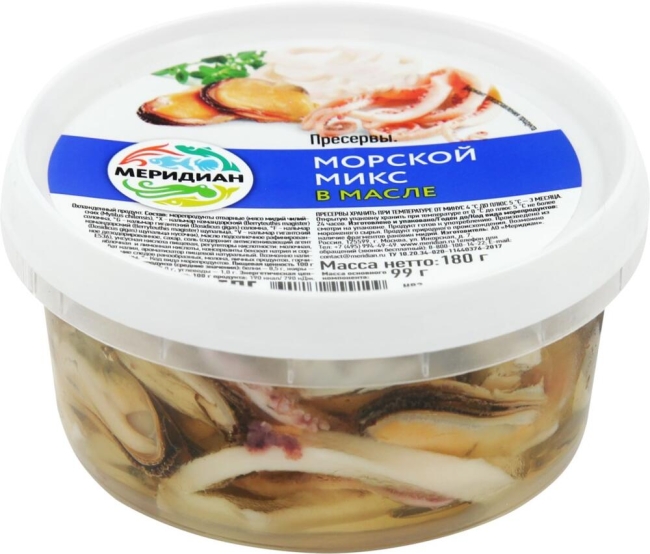 Морской микс Меридиан, составленный из мидий, кальмаров и щупалец кальмара, - идеальная основа для салата. Ценность морепродуктов - в высоком содержании белков при относительно низкой каллорийности. Морской микс в масле является питательным и полезным продуктом.