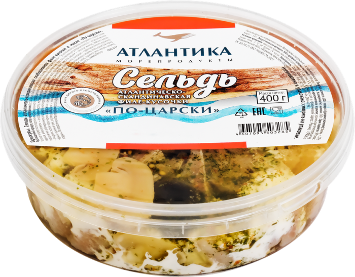 Сельдь АТЛАНТИКА По-царски филе-кусочки содержит высококачественный белок, а также множество необходимых нашему организму витаминов, таких как B12, D, омега-3 жирных кислот, селена, железа, фосфора. Продукт представлен в форме красивого цветка ручной выкладки, украшен грибочками и маслинами, приправлен кетчупом и майонезом.