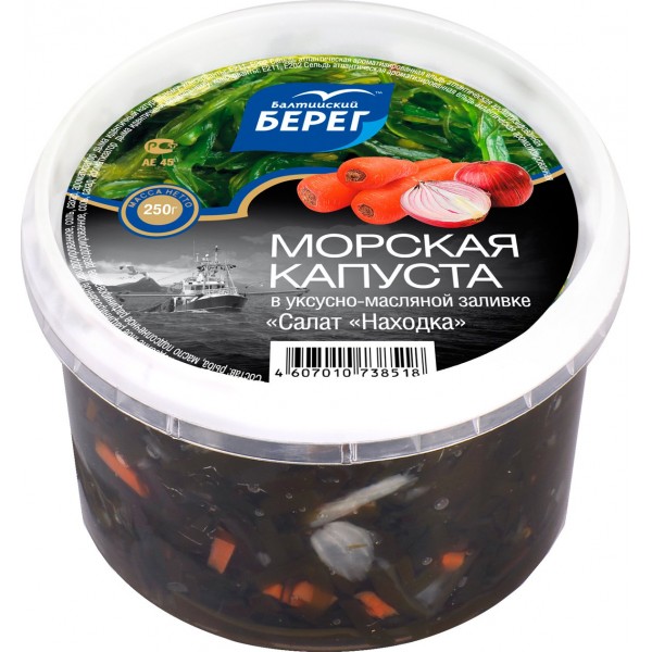 Морские водоросли (Laminaria japonica) резаные отварные маринованные, вода питьевая, овощи восстановленные (лук, морковь), масло подсолнечное рафинированное дезодорированное, соль, сахар, регулятор кислотности Е260, консерванты: Е211, Е202.