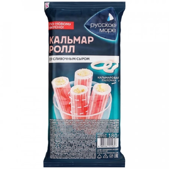 Палочки кальмаровые «Кальмар-ролл» имитация с сыром пастеризованные охлажденные. Состав: палочки кальмаровые (фарш рыбный (сурими): мясо рыбы (*М- минтай, *Х- хек тихоокеанский, *П- путассу, *А- макруронус американский), сахар, агент влагоудерживающий сорбит, стабилизаторы: пирофосфат натрия, полифосфат натрия; регулятор кислотности трифосфат натрия; вода питьевая, крахмал картофельный, соль, яичный белок, ароматизаторы (содержат антиокислитель альфа-токоферол, усилители вкуса и аромата: Е621, Е