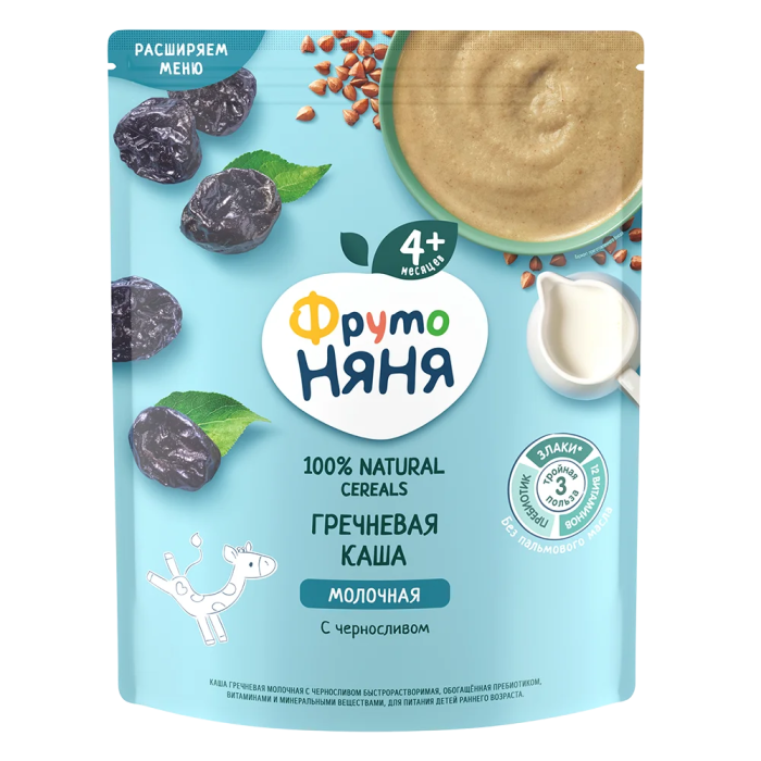 Мука гречневая, сахар, молоко сухое цельное, молоко сухое обезжиренное, масло растительное, пюре черносливовое концентрированное, пребиотик-инулин, витамины (С, Е, РР, пантотеновая кислота, В2, В1, В6, А, фолиевая кислота, D3, биотин, В12), минеральные вещества (железо, цинк, йод)