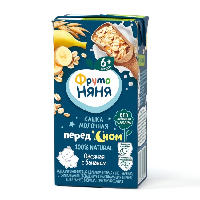 ФрутоНяня кашка молочно-овсяная с бананом, готовая к употреблению, стерилизованная, обогащенная пребиотиками, с фруктозой для питания детей раннего возраста. Гомогенизировання.