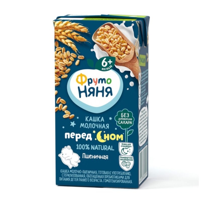 ФрутоНяня кашка молочно-пшеничная, готовая к употреблению, стерилизованная, обогащенная пребиотиками, с фруктозой для питания детей раннего возраста. Гомогенизированная.