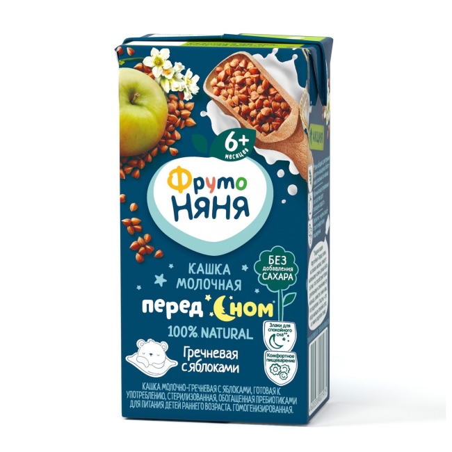 ФрутоНяня кашка молочно-гречневая с яблоками, готовая к употреблению, стерилизованная, обогащенная пребиотиками, с фруктозой для питания детей раннего возраста. Гомогенизированная.