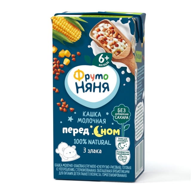ФрутоНяня кашка молочно-злаковая (гречнево-кукурузно-рисовая), готовая к употреблению, стерилизованная, обогащенная пребиотиками, с фруктозой для питания детей раннего возраста. Гомогенизированная.