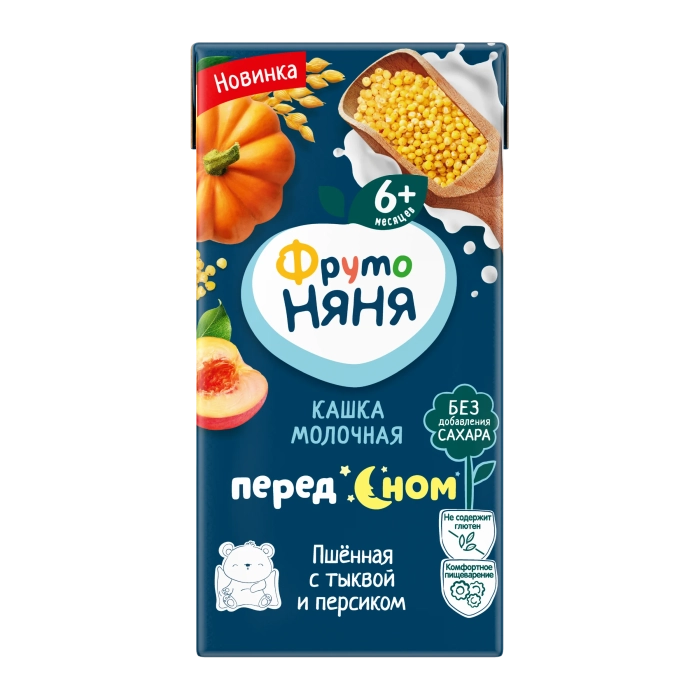 Пшённая кашка с тыквой и персиком «ФрутоНяня» поможет малышу дольше оставаться сытым, что способствует более длительному и спокойному сну.