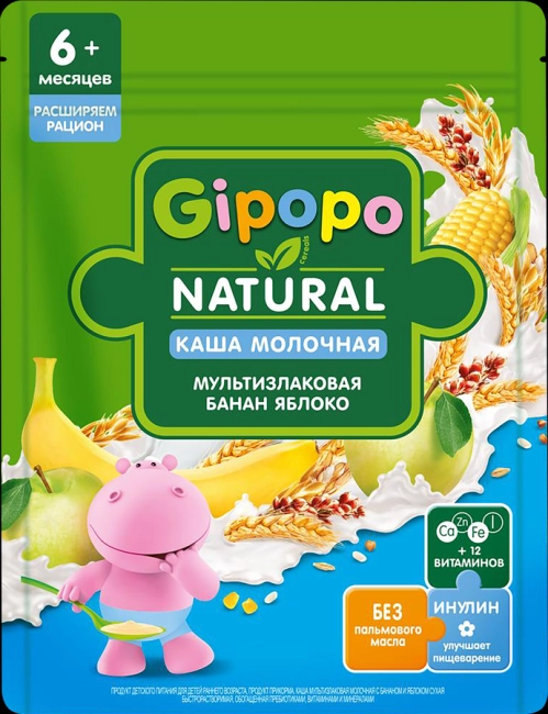 Каша мультизлаковая GIPOPO Natural молочная, с бананом и яблоком предназначена для питания детей в возрасте старше 6 месяцев. Она не требует варки, легко и быстро разводится в воде, не образуя комочков. Включение каши в рацион не только знакомит малыша с новой пищей, но и приносит пользу организму. Такой продукт является источником кальция, а также обогащен витаминами и инулином для улучшения пищеварения.