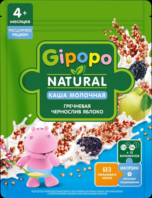 Каша гречневая GIPOPO Natural молочная, с черносливом и яблоком предназначена для питания детей в возрасте старше 4 месяцев. Она не требует варки, легко и быстро разводится в воде, не образуя комочков. Включение каши в рацион не только знакомит малыша с новой пищей, но и приносит пользу организму. Такой продукт является источником кальция, а также обогащен витаминами и инулином для улучшения пищеварения.