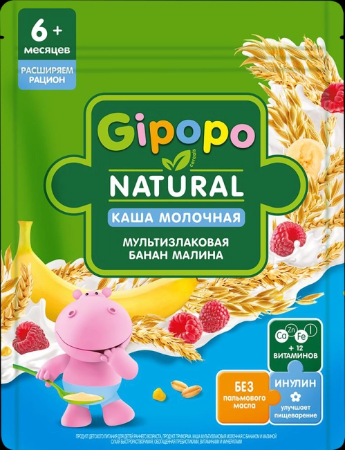 Каша мультизлаковая GIPOPO Natural молочная, с бананом и малиной предназначена для питания детей в возрасте старше 6 месяцев. Она не требует варки, легко и быстро разводится в воде, не образуя комочков. Включение каши в рацион не только знакомит малыша с новой пищей, но и приносит пользу организму. Такой продукт является источником кальция, а также обогащен витаминами и инулином для улучшения пищеварения.