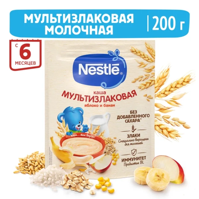 Мука (пшеничная (содержит глютен), овсяная (содержит глютен), рисовая, кукурузная), молоко сухое обезжиренное, низкоэруковое рапсовое масло, хлопья банана, подсолнечное высокоолеиновое масло, подсолнечное масло, хлопья яблока, кальция карбонат, соль, витаминно-минеральный премикс (С (L-аскорбиновая кислота), РР (никотинамид), цинка сульфат, E (DL-альфа-токоферола ацетат), B5 (D-пантотенат кальция), A (ретинола ацетат), В1 (тиамина мононитрат), В6 (пиридоксин гидрохлорид), В2 (рибофлавин), йодид