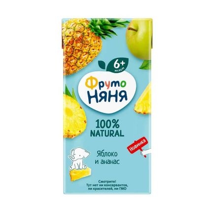 сок из яблок, сок из ананасов, сахар, регулятор кислотности-кислота лимонная, вода. Изготовлен из концентрированных соков. Объемная доля фруктового сока не менее 45%.