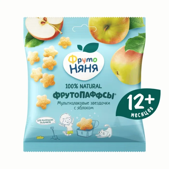 легкий перекус для вашего малыша, в составе которого нет ничего лишнего: сладкий вкус придают фрукты, энергией насыщают злаки. Интересные формы удобны для маленьких пальчиков и помогают развивать мелкую моторику ребенка. С ФрутоПаффсами сытно и весело в любой ситуации! Натуральный состав - без сахара, красителей, консервантов, ГМО. Польза злаков и любимые натуральные фруктовые вкусы. Развивают навыки жевания. Разнообразие рациона малыша дома ина улице. Продукт готов к употреблению. Может использ