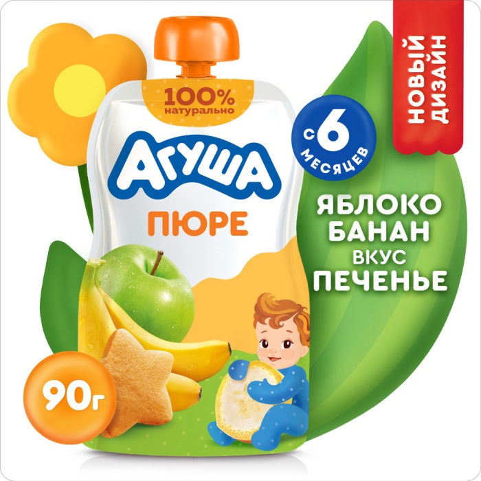 Детское фруктовое пюре Агуша разработано для питания детей с 4–6 месяцев. Минимально допустимый возраст знакомства с фруктовым пюре определяется рекомендациями по срокам введения конкретных фруктов. Начинать вводить фрукты в прикорм необходимо с гипоаллергенных монокомпонентных пюре из яблок или груш и уже после того, как малыш познакомился с детскими кашами, овощными и мясными пюре. Бананы имеют приятный вкус, пюре детское фруктовое Агуша Яблоко-Банан-Печенье - это детское питание, которое помо