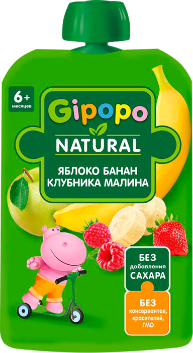 Пюре фруктово-ягодное GIPOPO Яблоко, банан, малина и клубника, с 6 месяцев, 90г