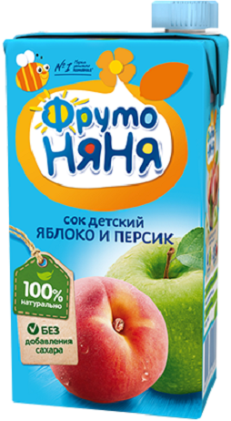 ФрутоНяня сок яблочно-персиковый неосветленный для детского питания детей дошкольного и школьного возраста. Восстановленный. Продукт стерилизован и асептически упакован.