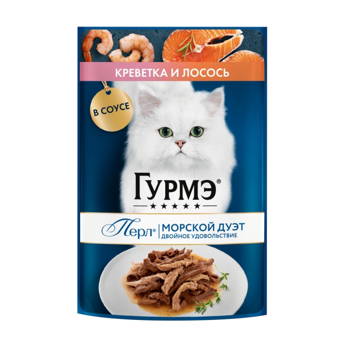 Влажный корм для взрослых кошек ГУРМЭ® создан специально для питомцев, которые ценят качество и разнообразие вкусов и текстур. ГУРМЭ® Перл Морской Дуэт — это нежные ломтики мини-филе с изысканными комбинациями вкусов креветок и лосося в роскошном соусе. Мы заботимся о том, чтобы корм для вашего пушистого друга был не только питательным, но и ощущался питомцем, как гастрономический праздник. Именно поэтому эксперты в сфере кормов для животных создали гармоничное сочетание сразу двух вкусов, котор