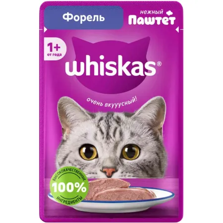 Корм консервированный полнорационный WHISKAS® для взрослых кошек паштет с добавлением форели «Форель».