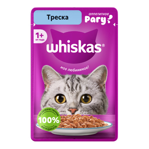 Корм консервированный полнорационный WHISKAS® для взрослых кошек рагу с добавлением трески «Треска».
