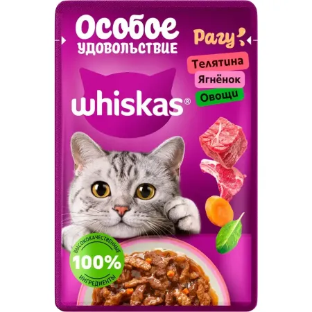 Корм консервированный полнорационный WHISKAS® для взрослых кошек рагу с добавлением телятины, ягнёнка и овощей «Особое удовольствие. Телятина, ягнёнок и овощи».