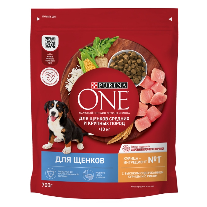 Корм Purina ONE® (ПУРИНА УАН) для щенков средних и крупных пород (>10кг) — это высококачественное полнорационное питание, разработанное экспертами Пурина для поддержания здоровой микрофлоры кишечника. Баланс микрофлоры важен для здоровья пищеварительной системы, иммунитета и общего состояния собаки. Корм Purina ONE® для щенков также подходит беременным и кормящим собакам. Сухой корм для щенков Purina ONE® с высоким содержанием курицы и с рисом 700 г — это: • Курица — №1 ингредиент в составе • Хр