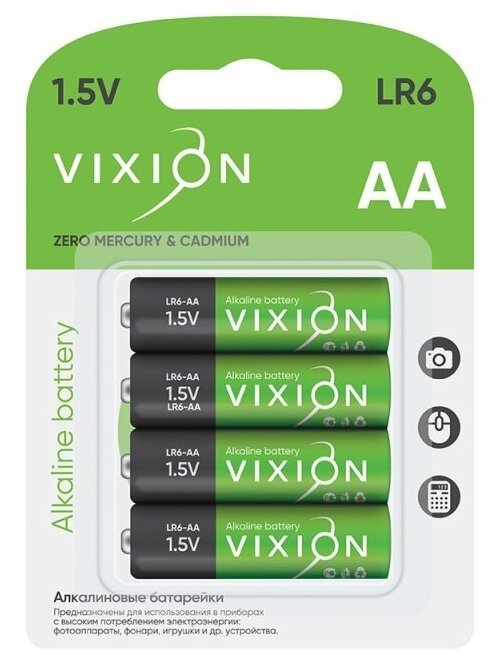 Алкалиновые батарейки Vixion LR6 подходят для питания энергоемких устройств, без подключения к электросети: мощных фонариков, детских игрушек, музыкальных плееров и колонок, фото/видеокамер, радиоприемников, геймпадов и других устройств с большим потреблением энергии. Батарейки относятся к щелочным элементам питания, именуются также «пальчиковыми». Они имеют более длительный срок хранения и службы, чем солевые батарейки. Алкалиновые батарейки устойчивы к перепадам температуры и высоким нагрузкам