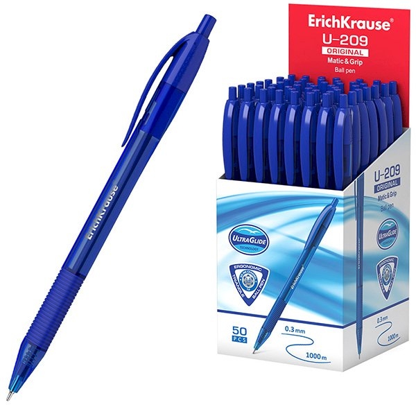 Ручка шариковая автоматическая ErichKrause U-209 Original Matic&Grip обеспечивает мягкое и комфортное письмо. Имеет прозрачный тонированный пластиковый корпус трехгранной формы. Оснащена профилированной резиновой грип-зоной, предотвращает скольщение пальцев при письме. Шестиканальный пишущий узел игольчатого типа имеет диаметр шарика 1 мм, толщина линии письма 0,3 мм. Максимальная длина непрерывной линии 1000 м. Чернила синего цвета пониженной вязкости. Длина ручки 144 мм, диаметр 10 мм.