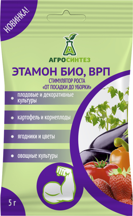 Препарат Агросинтез Этамон БИО 5 г ВРП улучшает приживаемость рассады овощных культур и взрослых крупномеров (в том числе, хвойных). Ускоряет наступление цветения у овощных культур и земляники. Обеспечивает пышное цветение у кустовых форм цветочных культур (например, пионы, сирень, гортензия) и дополнительные цветоносы у роз. Стимулирует начало раннего плодоношения на землянике, огурцах, томатах и др. Продлевает период плодоношения для огурцов, томатов, перцев, ремонтантной земляники. Ускоряет в