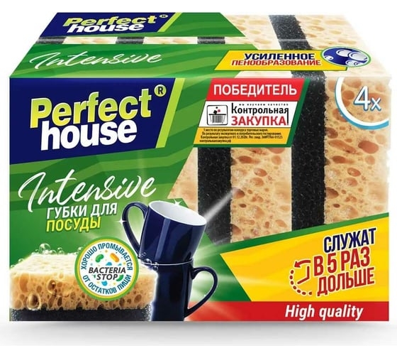 Губки для посуды Perfect House Intensive 4 шт 34182 в 5 раз дольше служат, чем стандартные поролоновые губки.