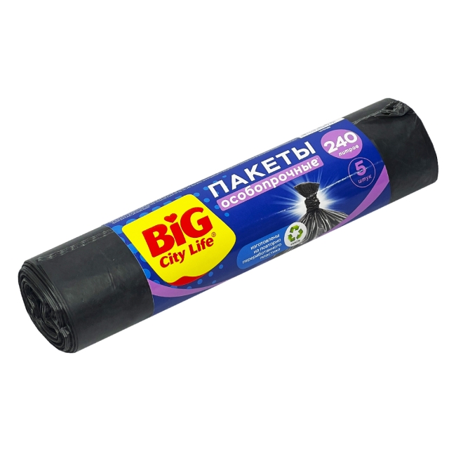 Пакеты для мусора BIG CITY LIFE LD особопрочные, 240 л, 5 шт черные. Очень прочные и эластичные пакеты BIG City Life. Высокая грузоподъемность. Тип шва 'Star', что позволяет лучше распределить груз по дну и минимизировать прорыв и выпадение мусора из пакет