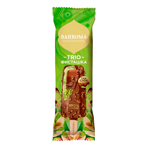 Мороженое (молоко цельное, вода питьевая, масло сливочное, сахар, патока крахмальная, молоко сухое обезжиренное, ядра кешью обжаренные дробленые, паста из фисташки, эмульгатор моно- и диглицериды жирных кислот, стабилизаторы (камедь рожкового дерева, гуаровая камедь, каррагинан), ароматизаторы, красители (медные комплексы хлорофиллинов, куркумин)); начинка шоколадная (сахар, масло растительное, какао-порошок, арахис, молочный шоколад (сахар, масло какао, какао тертое, молоко сухое цельное, сухая
