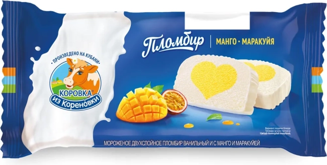 Состав: сливки, молоко цельное сгущённое с сахаром, молоко концентрированное обезжиренное, сахар, молоко обезжиренное, пюре манго, пюре из маракуйи, масло сливочное, смесь пищевых эмульгаторов и стабилизаторов (эмульгатор: моно- и диглицериды жирных кислот, стабилизаторы: камедь рожкового дерева, гуаровая камедь, каррагинан), ароматизатор ванилин.