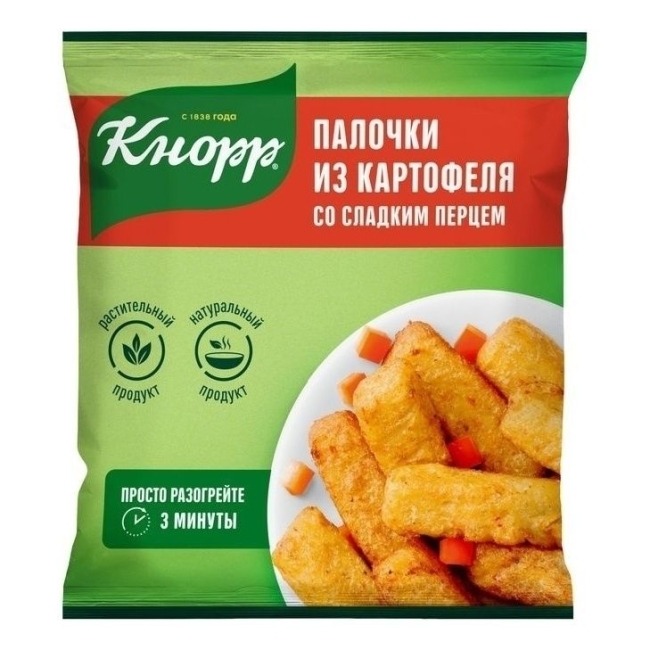Нет времени на приготовление завтрака или ужина? Замороженные полуфабрикаты из картофеля Кнорр станут помощниками в приготовлении полноценных блюд, а также закусок. Вкусные продукты из картофеля с хрустящей корочкой для всей семьи будут готовы за 3 минуты!Палочки из картофеля со сладким перцем Кнорр – это натуральный продукт, состоящий из вареного картофеля, сладкого перца, пшеничной клетчатки, подсолнечного масла, йодированной соли, кукурузного крахмала, красного острого перца, декстрозы. Проду