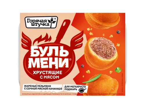 «БУЛЬМЕНИ ХРУСТЯЩИЕ С МЯСОМ» - это пельмени с сочной мясной начинкой с говядиной в тонком тесте, обжаренные до хрустящей золотистой корочки.