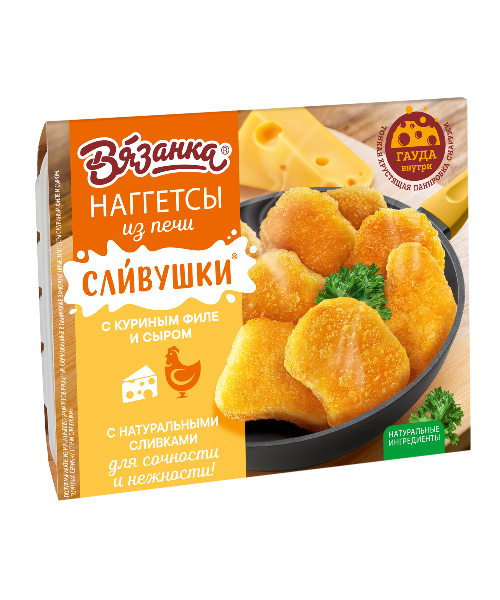 Филе грудки цыпленка-бройлера, продукт плавленый с сыром "Гауда со сливочным вкусом" (вода питьевая, масло растительное, молоко сухое, сыр "Гауда" (молоко пастеризованное, бактериальная закваска мезофильных молочнокислых микроорганизмов, молокосвёртывающий ферментный препарат микробного происхождения), соль, регулятор кислотности: лимонная кислота, ароматизатор "Сливочный", краситель: каротины), вода питьевая, филе грудки куриной с кожей, мука пшеничная хлебопекарная высший сорт, крупа манная