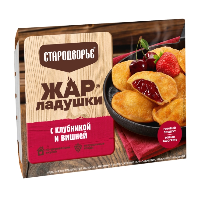 мука пшеничная хлебопекарная высший сорт, вода питьевая, клубника замороженная, сахар, вишня замороженная, загустители (Е1414, камеди: тары, конжак, гуаровая, ксантановая, целлюлозы, Е1422), продукты яичные, соль, масло растительное, глютен пшеничный, крахмал (картофельный, кукурузный), молоко сухое, стабилизатор: карбонат кальция, регуляторы кислотности (пирофосфаты, фосфаты кальция), антиокислители (лимонная кислота, Е304), разрыхлитель: карбонаты натрия, пряности и экстракты пряностей (паприк