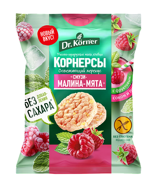 крупа рисовая шлифованная, сок яблочный концентрированный, крупа кукурузная, пюре малиновое, ароматизатор пищевой натуральный: вкус малина, ароматизатор пищевой натуральный: вкус мята, соль йодированная, эфирное масло мяты, растительный экстракт «экстракт мяты».