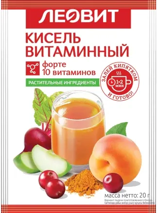Предназначен в качестве источника витаминов С, РР, E, B6, B2, В1, B12, кальция пантотената, кислоты фолиевой, биотина. Этот кисель будет полезен при повышенных психоэмоциональных и физических нагрузках, а также тем, кто восстанавливается после болезни, хочет восполнить недостаток витаминов, вызванный однообразным рационом, желает обеспечить поддержку организма при авитаминозе и в сезон простуд.