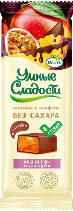 патока, вода питьевая, подсластитель - мальтит, желирующий агент - пектин, влагоудерживающий агент - лактат натрия, регулятор кислотности - кислота лимонная, консервант - сорбат калия, ароматизаторы ""Манго"", ""Маракуйя"", краситель - бета-каротин, подсластитель - стевиозид, кондитерская глазурь (глазурь кондитерская какаосодержащая (подсластитель мальтит, заменитель какао-масла лауринового типа, какао-порошок, эмульгатор лецитин, полиглицерин, ароматизатор пищевой ванилин, подсластитель стевио
