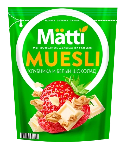 Мюсли Matti Клубника и белый шоколад - хрустящие кранчи мюсли из цельного зерна и натуральных ягод напомнят вам о лете. Идеальное сочетание злаков, клубники и белого шоколада дарят освежающий вкус милкшейка и заряд энергии.